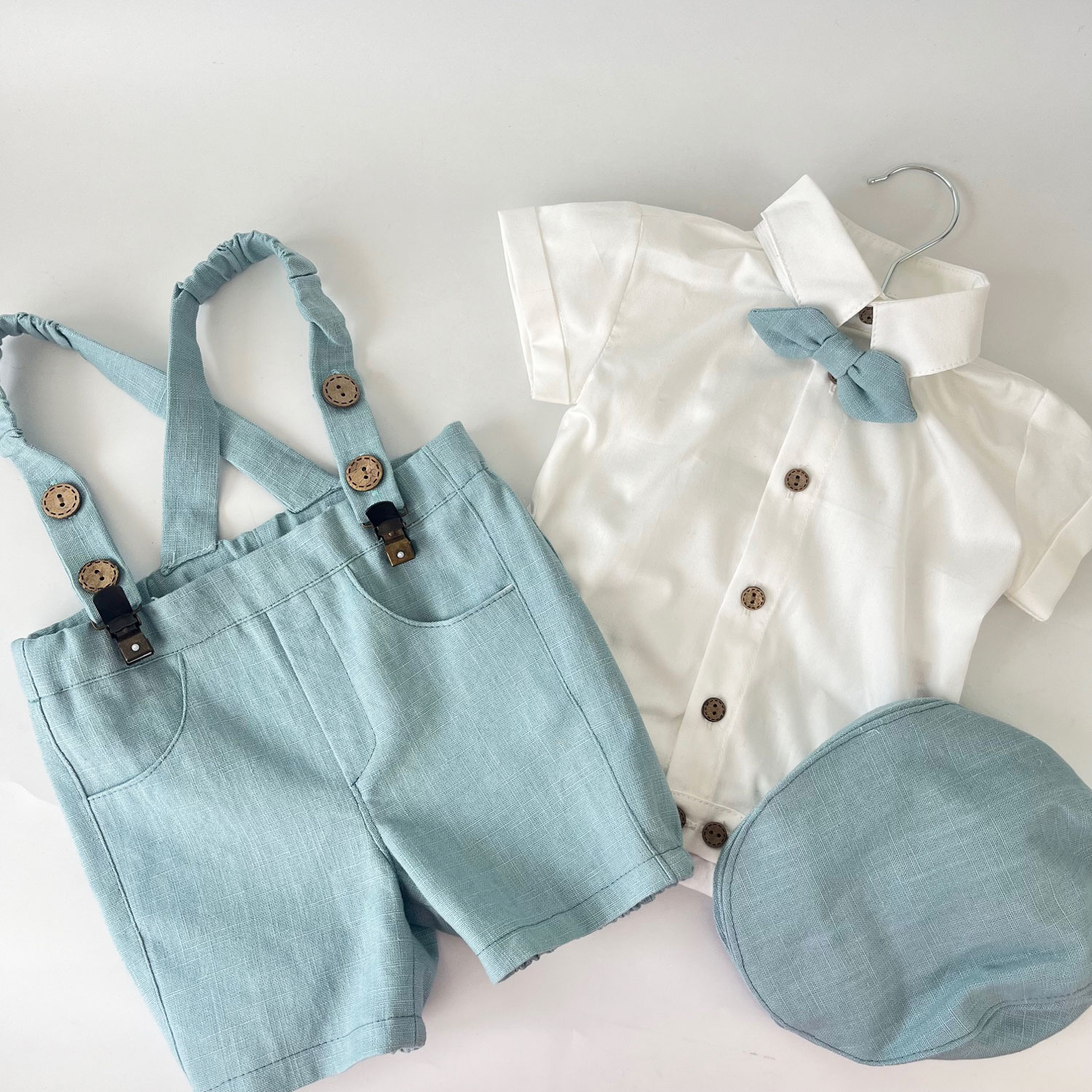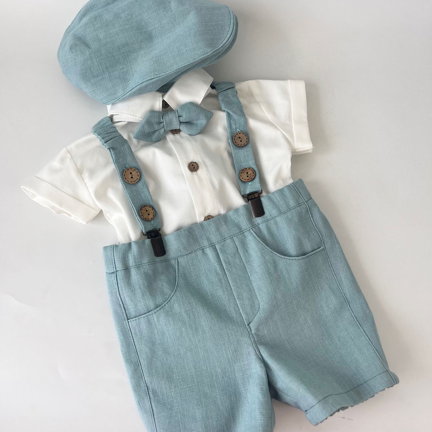 Salopeta cu bretele, papionul și basca sunt confecționate din in bleu, iar cămașa tip body (închidere cu nasturi) este realizată din bumbac 100%.