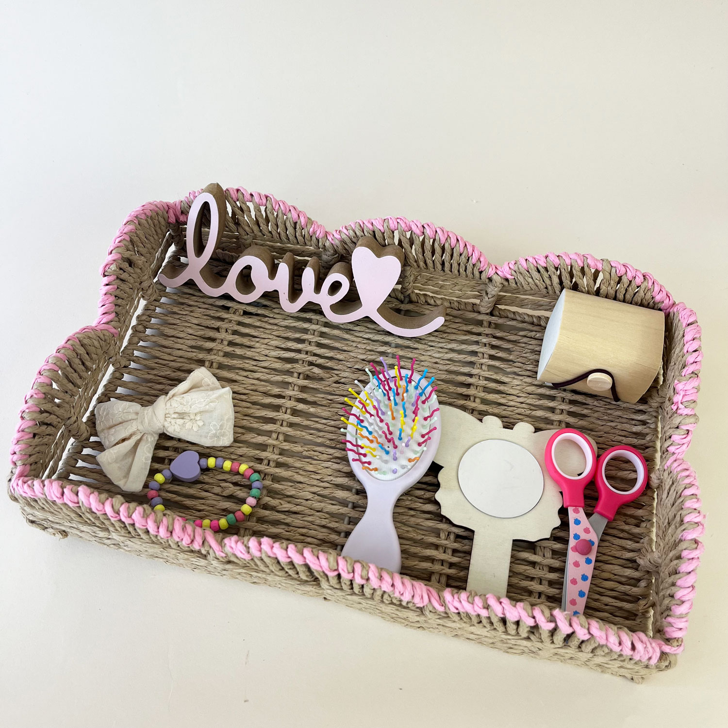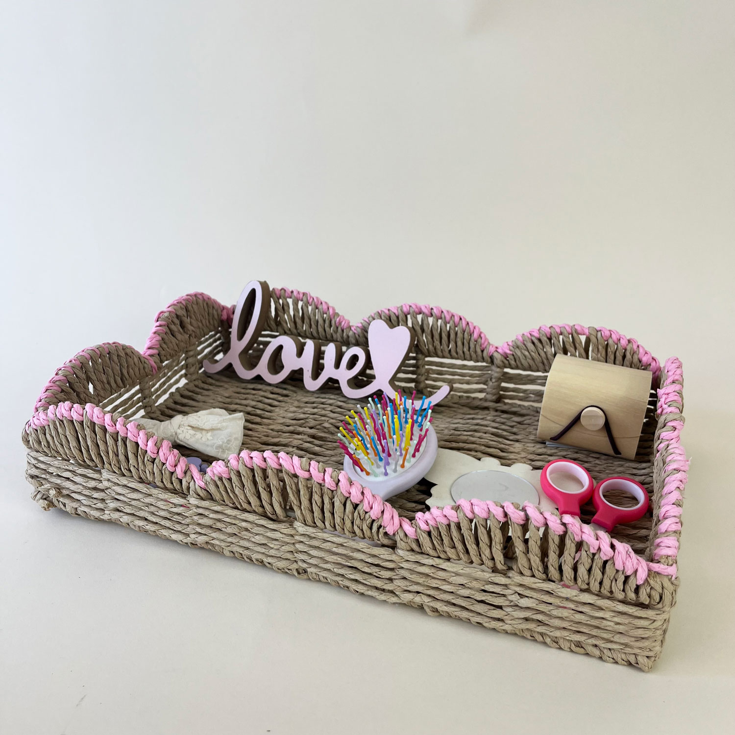 – tavă dreptunghiulară din rafie, margini roz (35/23cm)