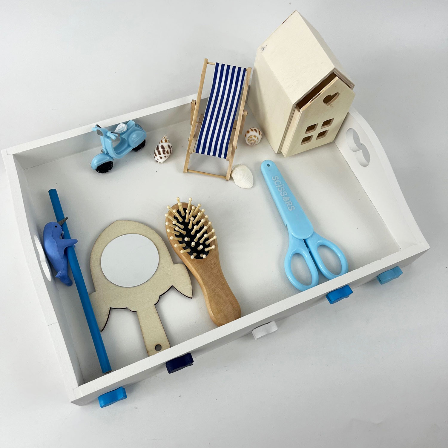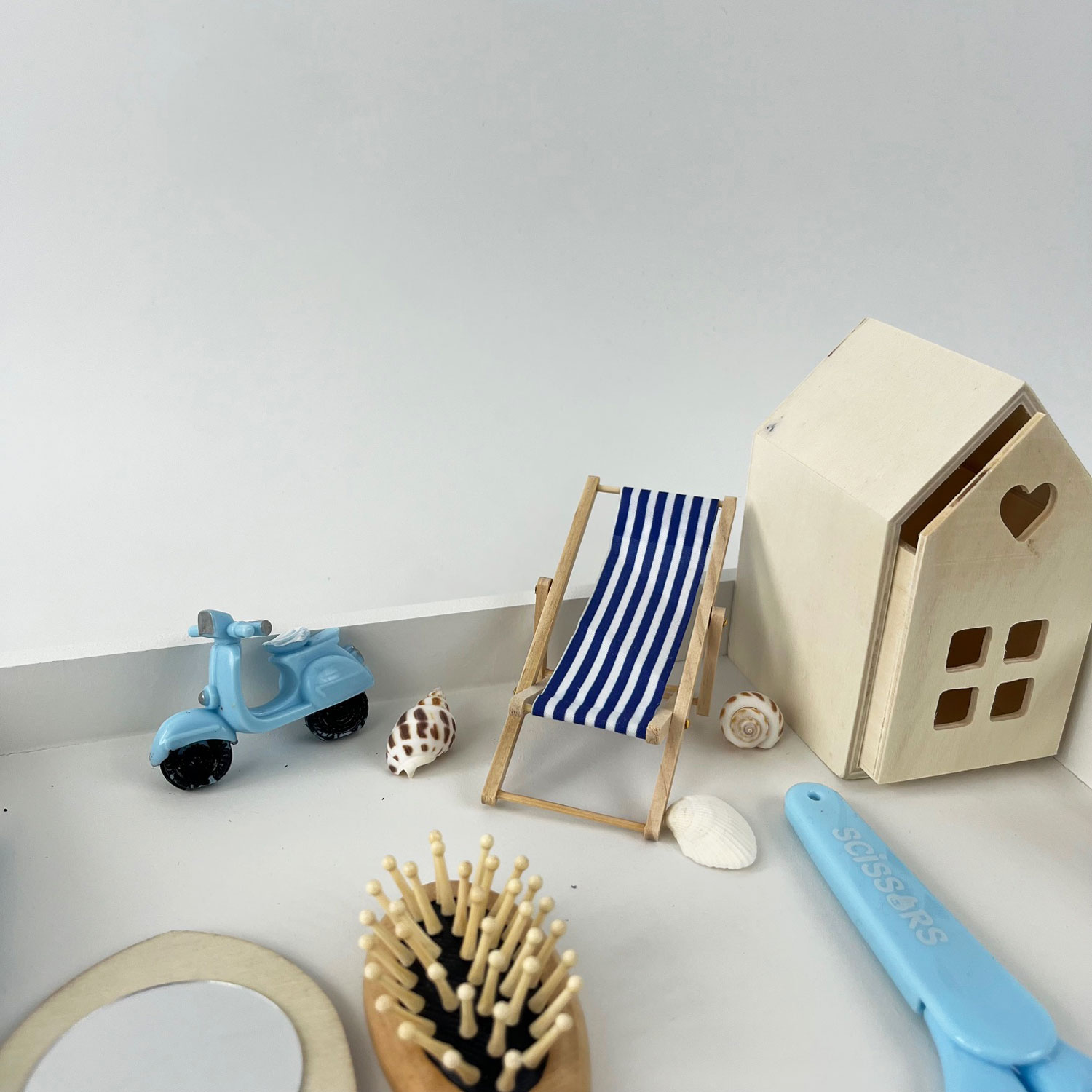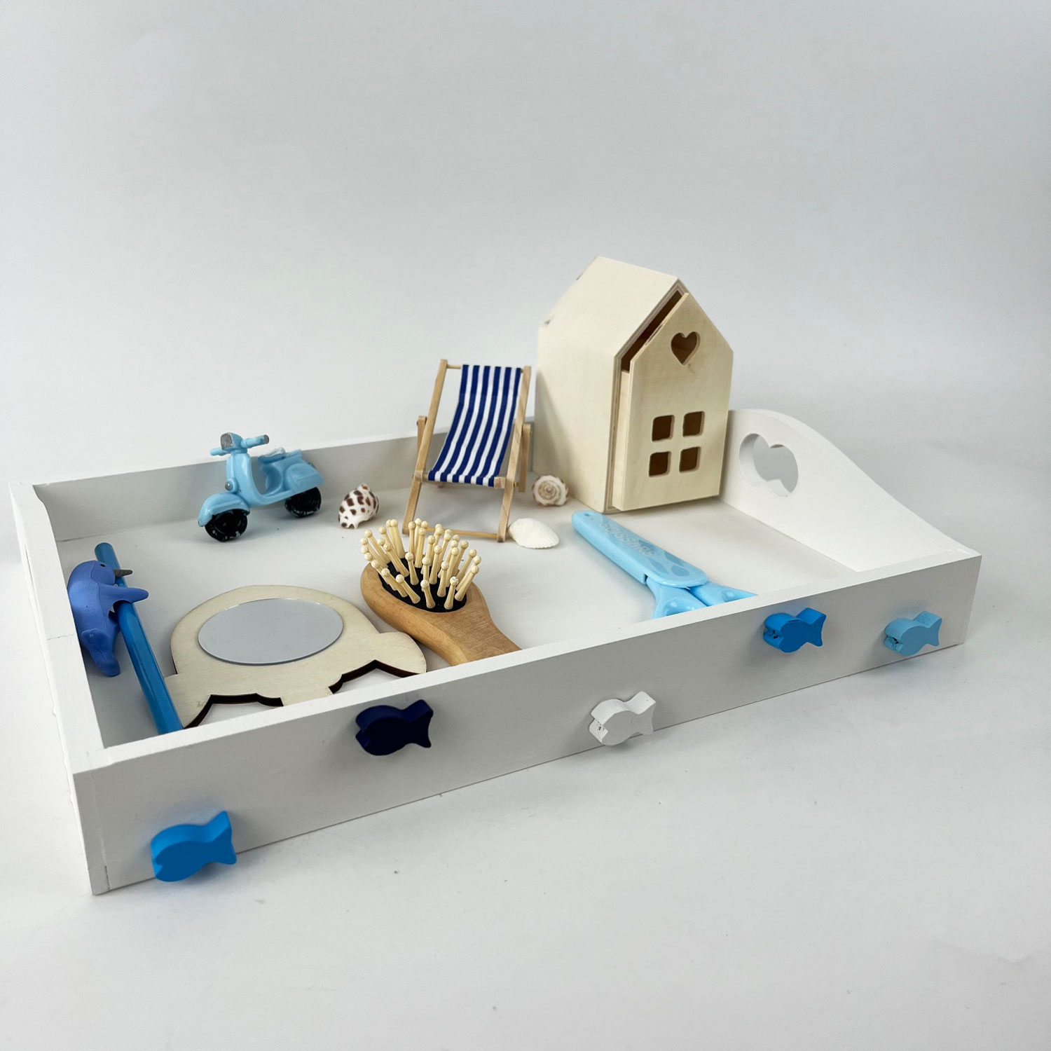 -decorațiuni (sezlong din lemn, scuter, peștișori din lemn pe latura din față a tăviței)