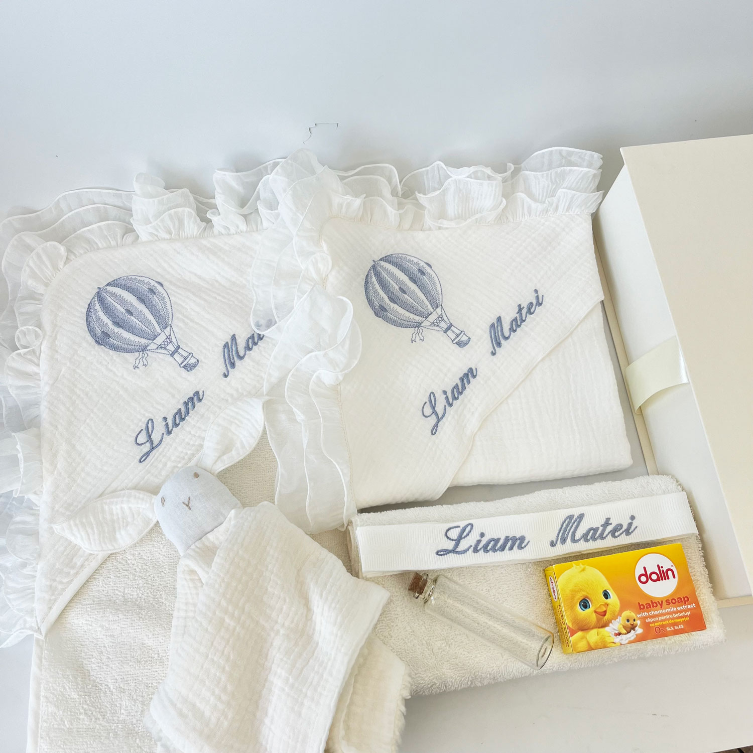 Trusoul de botez cu volane și broderie Balon aer cald conține: muselină (2 straturi) cu glugă, volane și broderie Balon aer cald, prosop cu glugă, volane și broderie Balon aer cald, fașă, sticluță pentru mir, iepuraș, săpun și prosop pentru preot și cutia Monzi. Se livrează între 4-8 zile lucrătoare. După plasarea comenzii, veti primi un telefon pentru a confirma produsele și pentru a discuta anumite detalii.