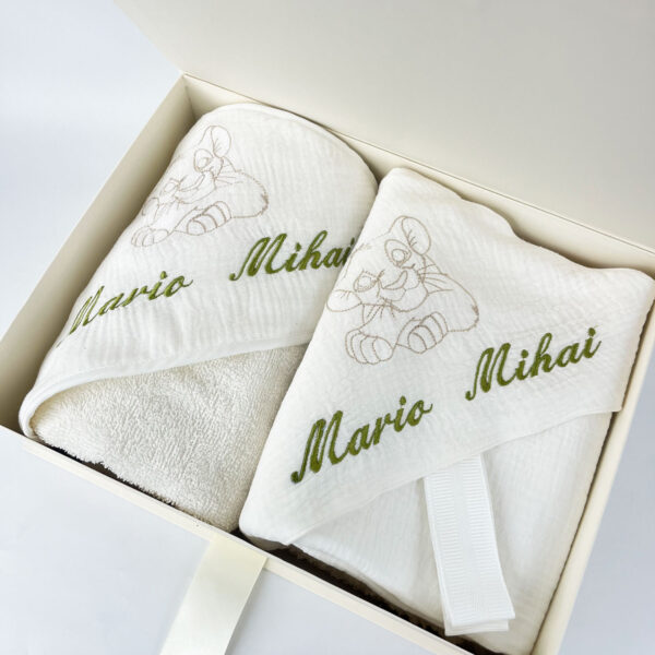 Aveți posibilitatea de a vă alege produsele din trusou pe care le doriți personalizate, selectând fiecare produs în parte și apoi specificând atât textul care să apară pe acestea, cât și culoarea pentru broderie. Prețul pentru personalizarea produselor prin broderie se adaugă ulterior, în funcție de textul dorit și de numarul de produse personalizate.