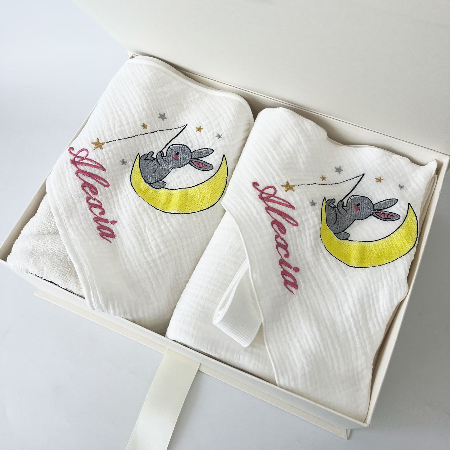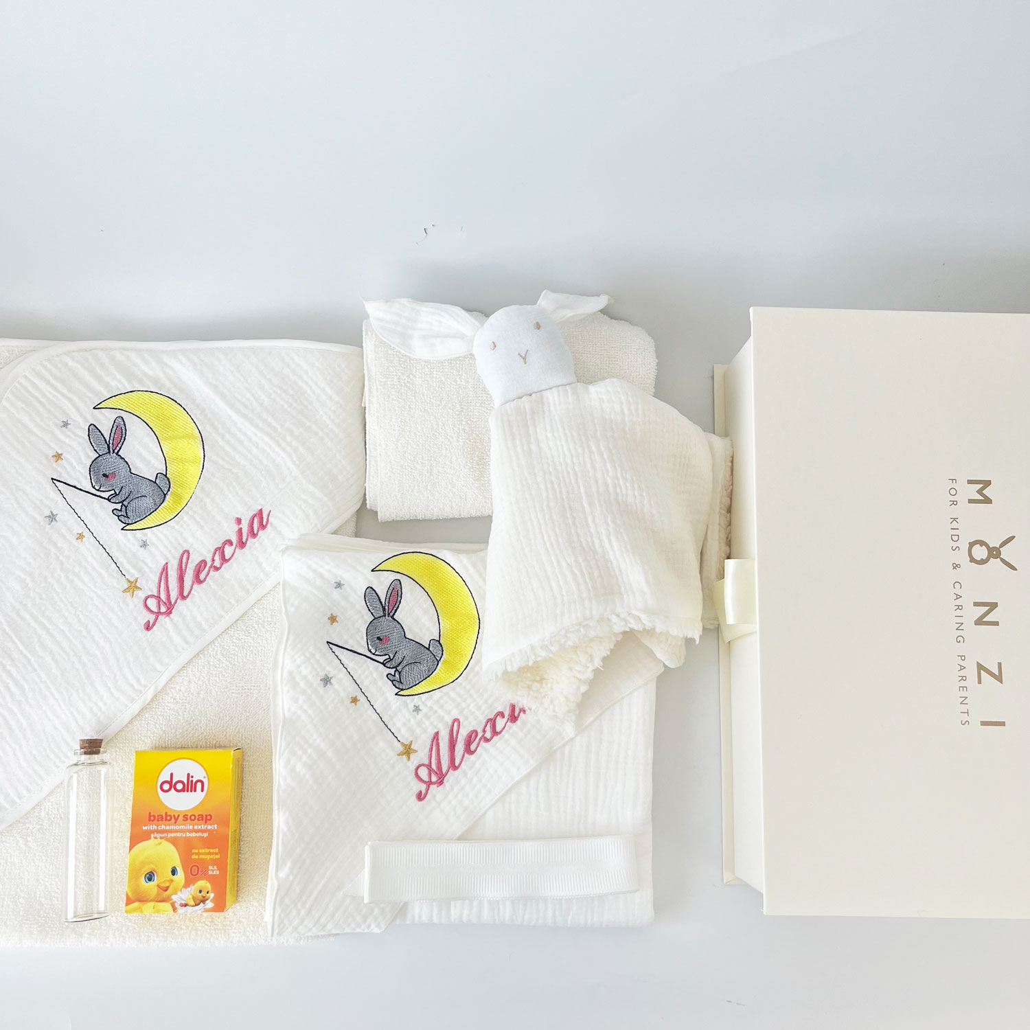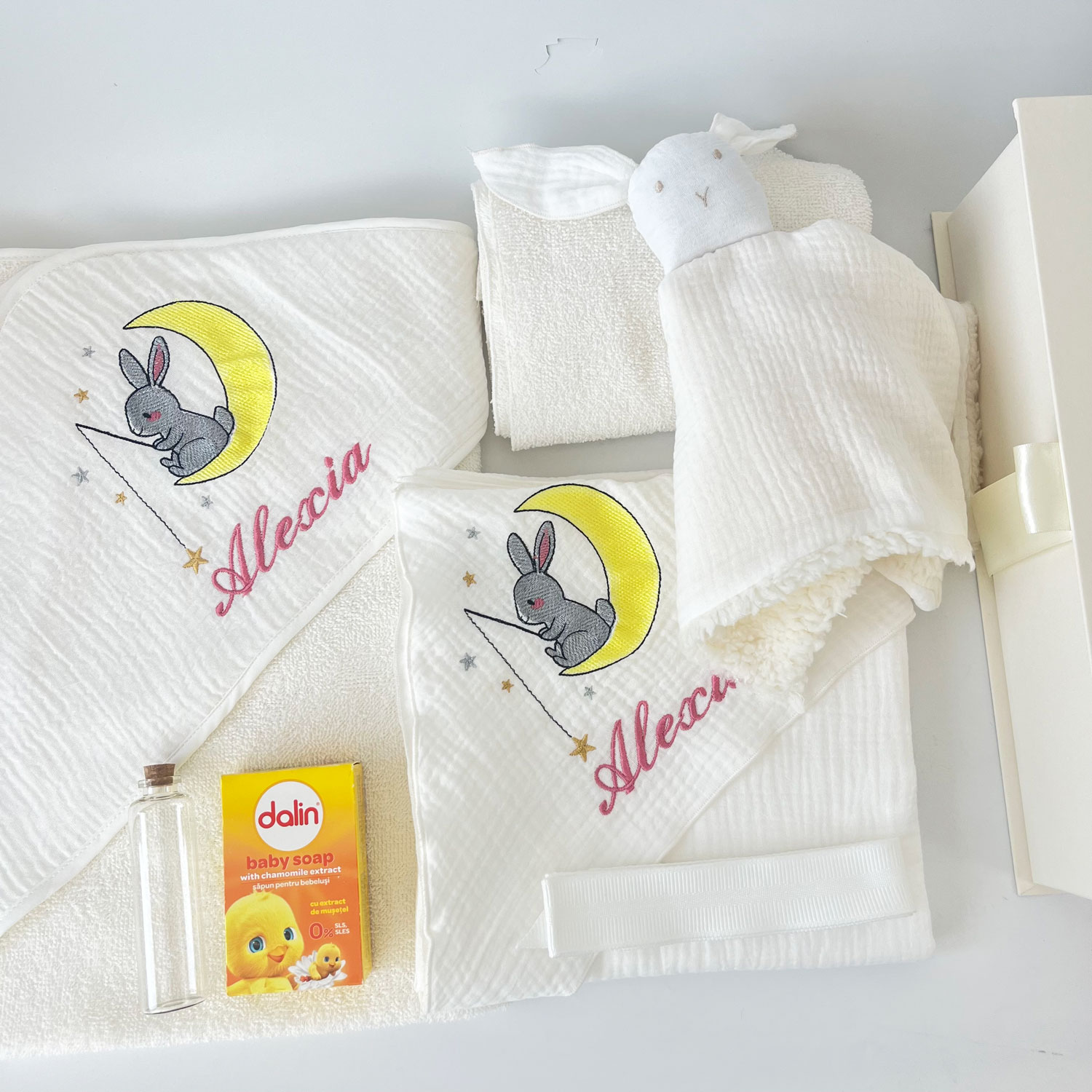 Trusoul de botez Iepuraș conține: muselină (2 straturi) cu glugă și broderie iepuraș, prosop cu glugă și broderie cu iepuraș, fașă, sticluță pentru mir, iepuraș, săpun și prosop pentru preot și cutia Monzi. Se livrează între 4-8 zile lucrătoare. După plasarea comenzii, veti primi un telefon pentru a confirma produsele și pentru a discuta anumite detalii.