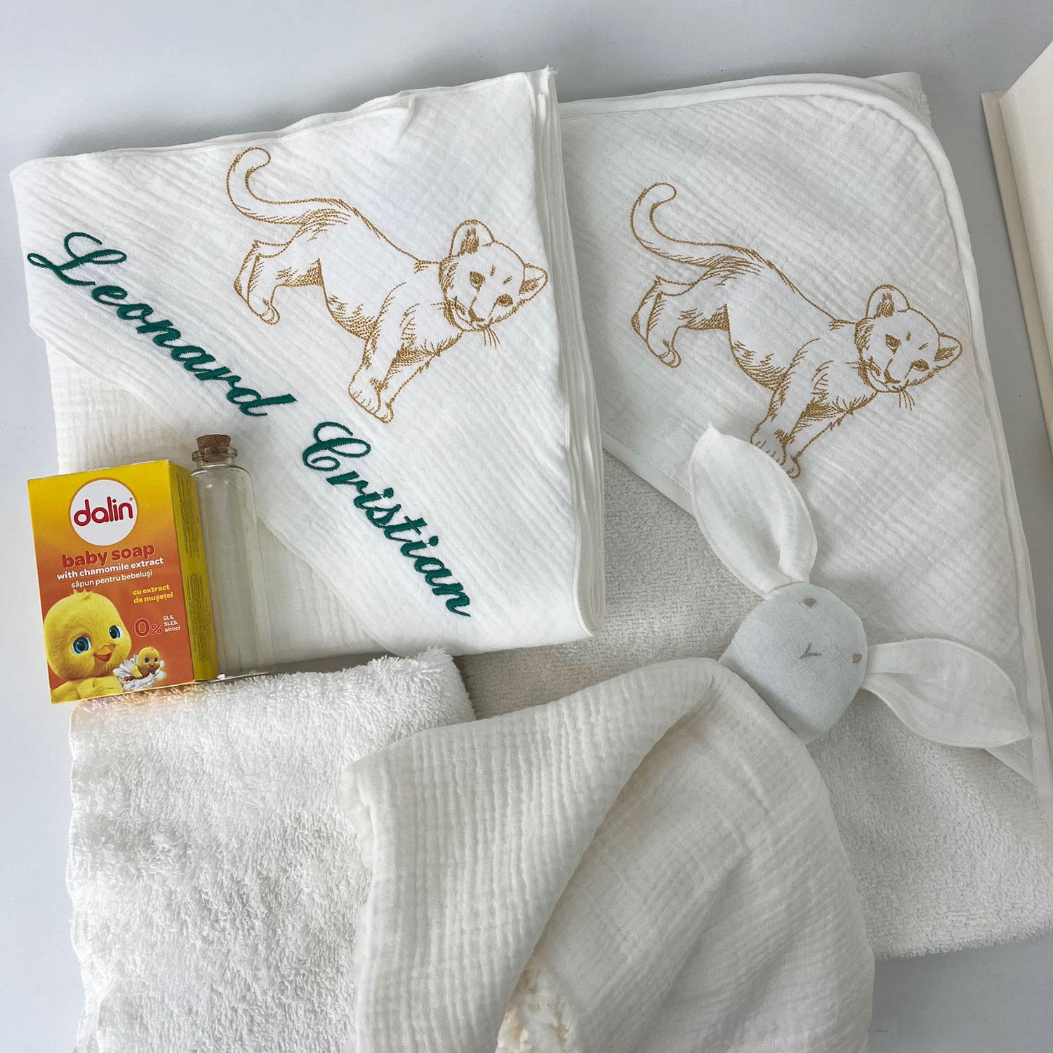 Trusoul de botez cu broderie Pui de Leu conține: muselină (2 straturi) cu glugă și broderie pui de leu, prosop cu glugă și broderie pui de leu, fașă, sticluță pentru mir, iepuraș, săpun și prosop pentru preot și cutia Monzi. Se livrează între 4-8 zile lucrătoare. După plasarea comenzii, veti primi un telefon pentru a confirma produsele și pentru a discuta anumite detalii.