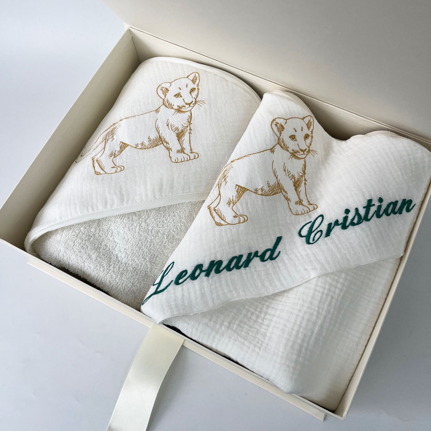 Trusou botez personalizat prin broderie cu pui de leu și nume bebe